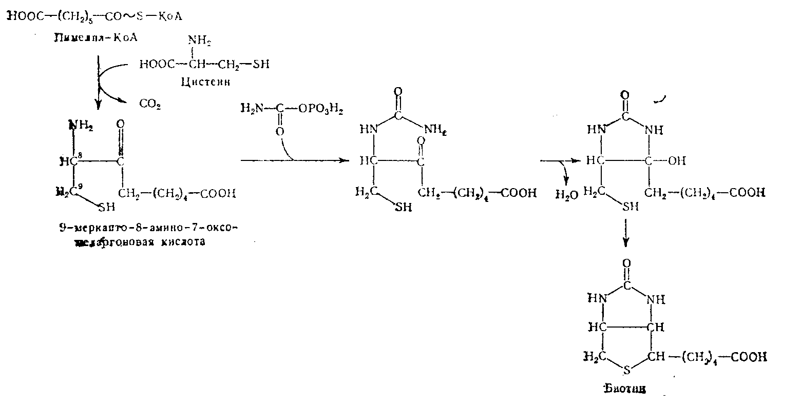 Согласно этой схеме, началом синтеза является конденсация пимелил-КоА и цистеина. Затем происходит декарбоксилирование, что приводит к образованию 9-меркапто-8-амино-7-оксопеларгоновой кислоты. Взаимодействие аминогруппы этой кислоты с карбамилфосфатом вызывает образование уреидного производного, которое после отщепления воды может циклизоваться, давая биотин с характерным для него двойным циклом. По способности синтезировать биотин и дестиобиотин все исследованные организмы делятся на 4-е группы: