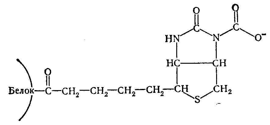Биотиновые ферменты представляют собой олигомеры с большим молекулярным весом (порядка 700000) и, как правило, содержат 4 моля связанного биотина на 1 моль фермента, поэтому кажется вероятным, что они состоят из 4 субъединиц с молекулярным весом 175000, каждая из которых содержит одну молекулу биотина. В работах Lynen (1964) расшифрован механизм участия биотина в реакциях карбексилирования. Установлено, что реакции карбоксилирования являются двухстадийными. Первая стадия сводится к образованию «активной С02» в форме С02~биотинфермента: