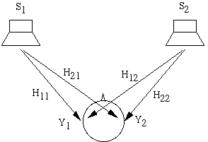 Идея CC просто выражается в терминах частот. На схемы выше сигналы S1 иS2 воспроизводятся колонками. Сигнал Y1 достигающий левого уха представляет собой смесь из S1 и "crosstalk" (части) сигнала S2. Чтобы быть более точными, Y1=H11 S1 + H12 S2, где H11 является HRTF между левой колонкой и левым ухом, а H12 это HRTF между правой колонкой и левым ухом. Аналогично Y2=H21 S1 + H22 S2. Если мы решим использовать наушники, то мы явно будем знать искомые сигналы Y1 и Y2 воспринимаемые ушами. Проблема в том, что необходимо правильно определить сигналы S1 и S2, чтобы получить искомый результат. Математически для этого просто надо обратить уравнение: