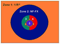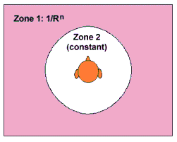 В DS3D предусмотрено три зоны (две из них показаны на рисунке слева). Зона 0 в ней располагаются сильно удаленные источники звука, которые имеют постоянную интенсивность, не зависящую от расстояния. Источники в этой зоне могут не приниматься во внимание, т.е. слушатель их не слышит, либо они используются для формирования реверберации. Зона 1 это т.н. дальнее поле, в ней располагаются источники на расстоянии более 1 метра от слушателя и до определяемой разработчиком границы. В этой зоне интенсивность источников звука обратно пропорциональна расстоянию до слушателя. В зоне 2 (ближнее поле, расстояние до 1 м от слушателя) все источники звука имеют постоянную интенсивность. Это сделано для того, чтобы уровень громкости не превысил допустимого барьера и с целью ограничения нагрузки на шину данных.