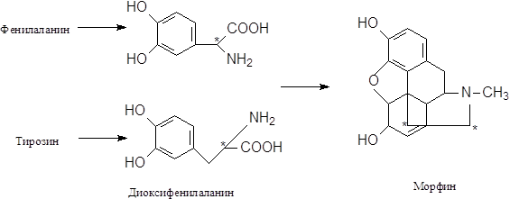 При кормлении мака Papaver somniforum мечеными фенилаланином и тирозином был получен морфин, содержащий изохинолиновое кольцо.