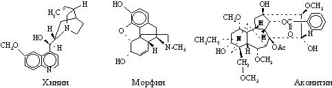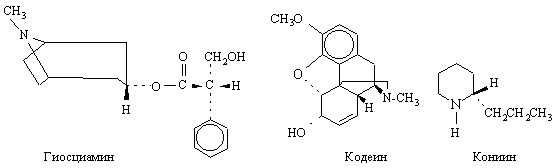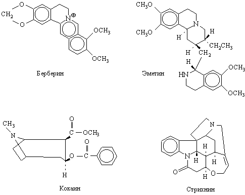 История открытия некоторых алкалоидов. Начало химии алкалоидов обычно относят к 1803, когда Л.-Ш.Деронь выделил из опиума – высохшего на воздухе млечного сока снотворного (опийного) мака Papaver somniferum – смесь алкалоидов, которую он назвал наркотином. Затем в 1805 Ф.Сертюрнер сообщил о выделении морфина из опиума. Он приготовил несколько солей морфина и показал, что именно морфином обусловливается физиологическое действие опиума. Позднее (1810) Б.Гомес обработал спиртовый экстракт коры хинного дерева щелочью и получил кристаллический продукт, который назвал «цинхонино,». П.Пельтье и Ж.Кавенту на фармацевтическом факультете Сорбонны (1820) выделили из «цинхонино» два алкалоида, названные хинином и цинхонином. Позднее исследователи получили более двух десятков оснований из экстрактов коры хинного дерева и растений рода ремиджия (Remijia) сем. мареновых. Между 1820 и 1850 было выделено и описано большое число алкалоидов новых разнообразных типов. Среди них аконитин из растений рода аконит (Aconitum, борец) – одно из наиболее токсичных веществ растительного происхождения; атропин – оптически неактивная форма гиосциамина и мощное мидриатическое средство (даже 4*10–6 г вызывают расширение зрачка); колхицин – алкалоид безвременника осеннего, применяемый при лечении подагры; кониин представляет особый исторический интерес, поскольку именно он стал орудием казни Сократа в 399 до н.э., когда великий философ был вынужден выпить чашу с настоем болиголова (Conium maculatum); кодеин – близкий к морфину алкалоид, являющийся ценным обезболивающим и противокашлевым средством; пиперин – алкалоид черного перца (Piper nigrum); берберин – алкалоид из корней барбариса обыкновенного (Berberis vulgaris); стрихнин – очень ядовитый алкалоид, содержащийся в семенах чилибухи (Strychnos nux-vomica) и используемый при некоторых сердечных болезнях и для истребления грызунов; эметин содержится в корне ипекакуаны (Cephaelis ipecacuanha, рвотный корень) – рвотное и противопротозойное средство, применяется для лечения амебной дизентерии; кокаин содержится в листьях тропических растений рода Erythroxylum, главным образом в коке (E. coca), используется в медицине как местноанестезирующее средство: