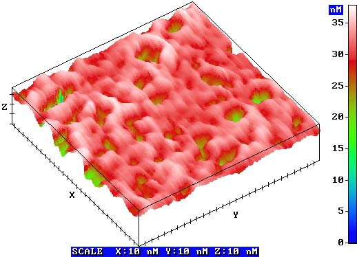 ССМ изображение алмазоподобной пленки на поверхности стекла. Размер скана 286x280 нм. Синтез углеродных алмазоподобных пленок ионным методом. Метод ионно-лучевого осаждения Одним из основных достоинств метода осаждения из ионных пучков является возможность получения веществ, не существующих в природе или находящихся при нормальных условиях в метастабильном состоянии (например, алмаз, карбид кремния). Ранее такие материалы получали только при высоких давлениях и температуре или в сильных ударных волнах. Рост пленки при ионно-лучевом осаждении позволяет получать плотные кристаллические модификации, не прибегая к традиционным методам. Существует большое количество веществ имеющих ряд устойчивых кристаллических модификаций. В каждом состоянии решетка будет обладать своим минимумом свободной энергии. Так для углерода существует несколько устойчивых модификаций соответствующих графиту, алмазу, металлическому углероду и другим плотным алмазоподобным структурам. В таком случае обеспечить ионам энергию, необходимого для преодоления потенциального барьера, отделяющего одну кристаллическую фазу от другой, можно простым регулированием потенциала подложки. Причем разброс ионов по энергии не должен превышать разность в высоте потенциальных барьеров, разделяющих две близких кристаллических модификации. Максимальная энергия падающих ионов определяется энергетическим порогом дефектообразования (для алмаза 60-80 эВ). С учетом возможной потери энергии падающих ионов и диапазон их энергетического распределения является важнейшим, но не единственным условием, т.к. механизм взаимодействия при синтезе материалов из энергетических ионных пучков сложен. Осаждение иона на поверхность сопровождается релаксационными колебаниями, разогревом поверхности за счет выделения энергии. Перечисленные эффекты, безусловно, не охватывают весь комплекс явлений сопровождающих процесс конденсации. Действие некоторых из них будет отрицательным для синтеза. Воздействовать на степень того или иного эффекта можно различными путями, например, изменять температуру подложки или условия подлета ионов к поверхности или одновременно с осаждением ионов облучать поверхность электронными или ионными пучками. В исследовании источником ионов является прототип космического электрореактивного двигателя (ЭРД), который в литературе называют ускорителем с анодным слоем и азимутальным дрейфом (УАД). В УАД разгон ионов происходит в квазинейтральной плазме, а потому могут быть получены более высокие, чем обычно, значения плотностей ионного тока. УАД обладает также рядом других достоинств: универсальностью к рабочему веществу, возможностью управления потока и т.д. Принципиальная схема источника показана на рис.1. Со стороны анода в ускоритель поступает поток ионов, которые создаются вблизи анода путем ионизации нейтральных атомов. Металлические стенки ускорительного канала находятся под катодным потенциалом. Магнитная система создает в кольцевом зазоре ускорителя радиальное магнитное поле, постепенно спадающее в области анода и у среза ускорителя. Магнитное поле в основном имеет поперечную компоненту, а электрическое - продольную, поэтому такие системы называют еще ускорителями в скрещенных электрических и магнитных полях или ВЕ разрядом. В ск