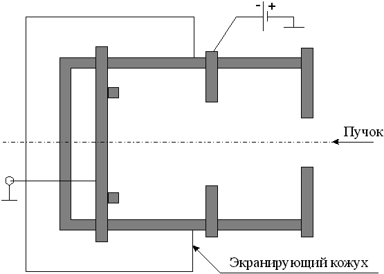 Ток и энергия пучка ускоренных частиц - это основные характеристики ускорителя любого типа, позволяющие определить производительность установки и возможность ее использования в том или ином производственном процессе или эксперименте. Цилиндр Фарадея - это наиболее распространенный прибор, используемый в качестве первичного эталонного прибора для измерения токов пучков заряженных частиц. При измерении тока, пучок частиц попадает на изолированный от окружающих предметов электрод, который задерживает частицы пучка и почти все вторичные частицы, образующиеся при столкновении частиц пучка с материалом электрода. Основные достоинства рассматриваемого метода - высокая точность и возможность измерения весьма малых токов. К недостаткам цилиндра Фарадея относятся большие размеры и невозможность получить информацию о токе пучка, не нарушив его. Принципиальная схема цилиндра Фарадея показана на рис.2.