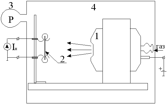 Описание установки. Схема используемой установки для напыления пленок показана на рис.3. В рабочий откачиваемый объем помещен источник ионов (1), формирующий поток ионизированного газа. Перед соплом источника крепится подложка (2) - пластина монокристалла кремния, нагреваемая пропусканием постоянного тока.