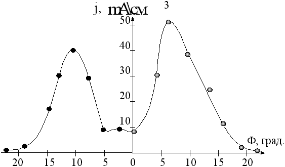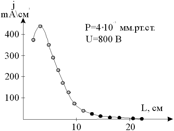 Температура подложки определялась по температурной зависимости сопротивления кремня, измеренной в ходе предварительной работы. Характеристики ионного источника При работе с ионным источником необходимо знать его характеристики. На рис.4,5 представлены зависимости плотности ионного тока в зависимости от расстояния до источника и угла в плоскости оси источника соответственно.