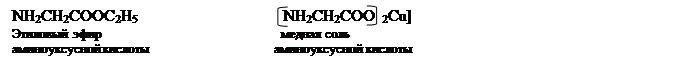 Для аминокислот особенно характерно образование медных солей, обладающих специфической синей окраской. Эти вещества являются внутренними комплексными солями; в них атом меди связан не только с атомами кислорода, но и с атомами азота аминогрупп: