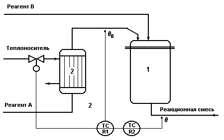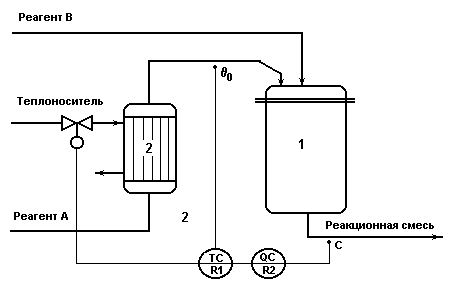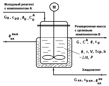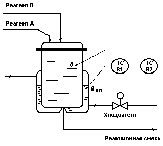 Схема реактора непрерывного действия с мешалкой с экзотермической реакцией 1-го порядка А В.