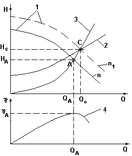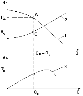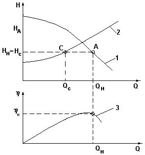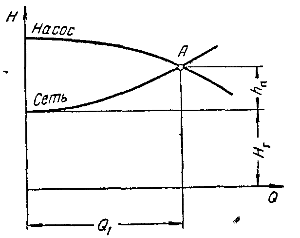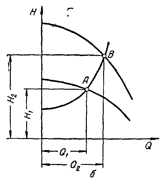 Нс =Нг + k*Q2 ; где Нг - геометрическая высота подачи; k*Q2 =hп - потери напора в сети ()А - рабочая точка, обеспечивающая максимальную производительность насоса Q1 при работе на данную сеть. Совместная работа насосов при параллельном соединении.