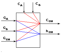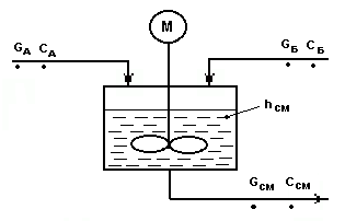 Объект управления Объект управления - емкость с мешалкой, аппарат непрерывного действия, в котором смешиваются две жидкости А (с концентрацией целевого компонента Са) и Б (с концентрацией целевого компонента Сб) для получения гомогенизированного раствора с заданной концентрацией целевого компонента Ссм. Схема объекта управления.