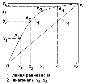 Диаграмма «Рабочая линия-линия равновесия» процесса ректификации.