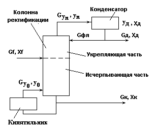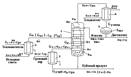 Работа установки. Исходная смесь Gп (Gxf) нагревается в подогревателе потока питания 2 до температуры кипения θп0 и подается в колонну 1 на тарелку питания (i=f). Исходная смесь стекает по тарелкам нижней части колонны в виде жидкостного потока Gx в куб колонны, участвуя в массообменном процессе с паровым потоком Gy. Из куба колонны выводится кубовый продукт Gкуб. Часть кубового продукта подается в кипятильник 3, где испаряется с образованием парового потока Gy0 , который подается в низ колонны. Паровой поток поднимается вверх колонны, контактируя с жидким потоком и обогащаясь целевым компонентом. Обогащенный целевым компонентом паровой поток Gyn выводится из верха колонны и подается в дефлегматор 4, где конденсируется. Конденсат собирается во флегмовой емкости 5. Из сборника флегмы отбирается два потока: