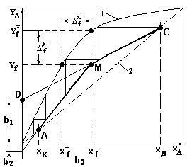 где xf - заданный состав жидкой фазы потока питания; yf - соответствующий ему равновесный состав паровой фазы потока питания. Рабочее флегмовое число находят из соотношений: R=1,3*Rmin+0,3 или R=σ* Rmin, где σ=1,2-2,5 - коэффициент избытка флегмы. Уравнение рабочей линии верхней (укрепляющей) части колонны.