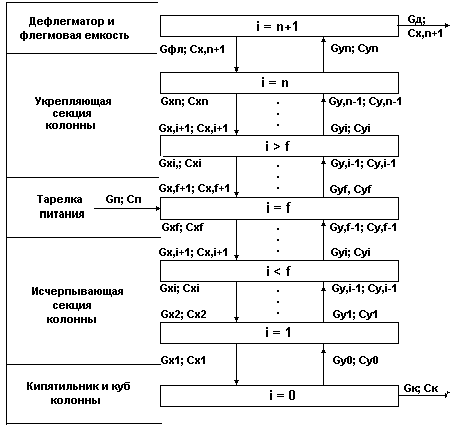 Схема колонны ректификации для математического описания рабочих линий процесса.