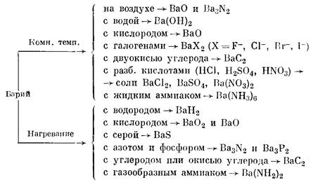 Схема 1 Восстановление окиси или хлорида бария В промышленности металлический барий получают термическим восстановлением окиси бария порошком металлического алюминия (избыток) при температуре 1200—1250°. Процесс идет в вакууме (0,1 мм рт. ст.). ЗВаО + 2А1 = ЗВа + Аl2О3 — 25 ккал Восстановление проводится в кварцевых или герметичных фарфоровых капсулах. После удаления воздуха током водорода в них создается вакуум, затем окись бария и порошок алюминия в течение 2—3 час нагревают при температуре 1250°. По окончании восстановления нагревание прекращают. После охлаждения перед разборкой установки в нее подают сухой воздух. Силикотермическое восстановление окиси бария проводится в вакууме в стальной трубке (температура 1200°): ЗВаО + Si = 2Ва + ВаSiO3 — 37 ккал В процессе магнийтермического восстановления окиси бария в вакууме получается металлический барий. В этом случае образуется промежуточный окисел Ba2O: 2ВаО + Mg = Ba2O + Mg0 Вa2О = Ва0 + Ва При цинкотермическом восстановлении окиси бария в вакууме образуется сплав цинка и бария. Металлотермическое восстановление хлорида бария натрием, калием или металлическим цинком в вакууме приводит к образованию сплавов бария с натрием, бария с калием и бария с цинком. Если восстановление хлорида бария идет при нагревании с карбидом кальция CaC2, образуется сплав бария и кальция. Термическое разложение гидрида и Ва(NH3)6Термическая вакуумная диссоциация гидрида бария (900—1000°), нитрида Ва3N2 (160—180°) и Ва(NH3)6 (комнатная температура) сопровождается образованием металлического бария. Электролиз хлорида барияПри электролизе расплавленного хлорида бария (или расплавленной смеси BaCl2— NaCI, BaCl2 — BaF2) с расплавленным свинцовым или оловянным катодом образуются сплавы бария со свинцом или оловом. Во время электролиза насыщенного раствора хлорида бария на ртутном катоде образуется амальгама бария. Электролитический метод вследствие трудоемкости практически не используется в промышленности. ОчисткаСырой металлический барий очищают перегонкой в вакууме (1—1,5 мм рт. ст., температура 800°) в аппаратуре, подобной применяемой для очистки магния. ХИМИЧЕСКИЕ И ФИЗИЧЕСКИЕ СВОЙСТВАБарий — белый серебристый металл с объемно-центрированной кубической решеткой (модификация α-Ва устойчива ниже 375°, модификация β-Ва — от 375 до 710°). Плотность бария 3,74 г1см3, твердость 3 по шкале Мооса (тверже свинца). Ковкий металл. При загрязнении ртутью становится хрупким. Т. пл. 710°, т. кип. 1696°. Соли бария окрашивают пламя газовой горелки в желто-зеленый цвет. Самый важный радиоактивный изотоп бария — (β- и γ-активный 140Ва — образуется при распаде урана, тория и плутония; период полураспада 13,4 дня. 140Ва извлекают хроматографически из смеси продуктов распада. Распад изотопа 140Ва сопровождается выделением радиоактивного 140La. При облучении цезия дейтронами образуется ядерный изотоп 133Ва с периодом полураспада 1,77 дней. Со свинцом, никелем, сурьмой, оловом и железом барий образует сплавы. Барий химически активнее кальция и стронция. Металлический барий хранят в герметичных сосудах под петролейным эфиром или парафиновым маслом. На воздухе металлический барий теряет блеск, покрывается коричневато-желтой, а затем серой пленкой окиси и нитрида: Ва + 1/202 = Ва0 + 133,1 ккал. ЗВа +N2 = Ba3N2 + 89,9 ккал Под действием галогенов металлический барий образует безводные галогениды ВаХ2 (X 