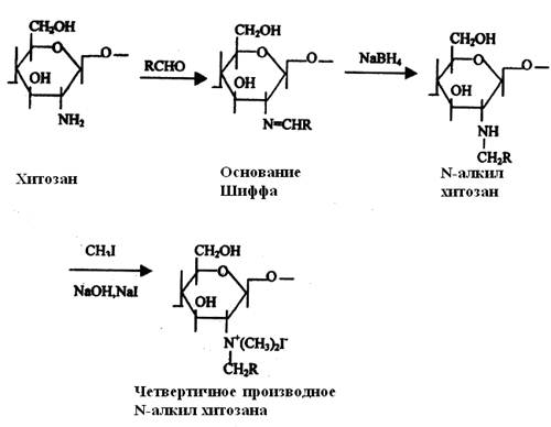 Рис.3 Синтез N-триметилхитозана йодида Было исследовано влияние молекулярной массы на антибактериальную и фунгицидную активность. При выявлении противобактериального действия четвертичного производного хитозана против Escherichia coli определяли минимальную ингибирующую концентрацию (МИК) и минимальную бактерицидную концентрацию (МБК) в воде, 0,25% и 0,5% среде уксусной кислоты. Результаты показывают, что антибактериальная активность против Escherichia coli связана с молекулярной массой. Антибактериальная активность четвертичных аммониевых солей хитозана в среде уксусной кислоты более выражена, чем в воде. Их противобактериальное действие тем более выраженное, чем выше концентрация уксусной кислоты. Так же было найдено – бактерицидное действие производного сильнее, чем хитозана. [1] Хитозан с молекулярной массой в пределах от10000 до 100000 может быть полезен для ограничения роста бактерий. Хитозан кальмара с молекулярной массой 220000 проявляет наибольшую противобактериальную активность. Хитозан со средней молекулярной массой 9300 эффективен для ограничения роста Escherichia coli, в то время как хитозан с молекулярной массой 2200 ускорял рост численности бактерий. [1] В отечественной литературе есть информация о синтезе четвертичных аммониевых соединений хитозана с применением органических оснований, и исследования, посвященные свойствам полученных соединений Для синтеза применялись перегнанные сухие метил- и этилиодид. Иодистоводородную кислоту, образующуюся во время реакции, связывали органическими основаниями: пиридином, 2,4-лутидином, 2,4,6-коллидином и триэтиламином. Полученное соединение выделяли из реакционной смеси фильтрованием, отмывали метанолом, сушили. Было установлено, что рКа хитозана 6.30. Был сделан вывод, что повышение степени N-алкилирования будет наблюдаться при использовании оснований с рКа > 6.30. Опыты показали, что наиболее глубоко реакция идет в присутствии триэтиламина, рКа которого гораздо выше, чем у хитозана. Установлено, что N-триметил- и N-триэтилхитозаны являются полиэлектролитами и их основность увеличивается с ростом степени замещения. [4] 2.2 Лечение ран с применением N-карбоксибутил хитозана У больных, перенесших восстановительную хирургию, донорские участки лечились мягкими прокладками N-карбоксибутилхитозана. При сравнении с контрольными донорскими участками была обнаружена лучшая васкуляризация и отсутствие воспалительных клеток на кожном уровне. Применение N-карбоксибутилхитозана приводило к формированию регулярно организованной кожной ткани и уменьшало аномальное заживление. [2] Одно из преимуществ N-карбоксибутил хитозана при заживлении ран - обеспечение гелеподобного слоя при контакте с раневыми жидкостями. Данный слой обеспечивает превосходную защиту недавно сформированных тканей от механических повреждений. Внешняя поверхность прокладки принимала вид корки и обеспечивала защиту против вторичных инфекций ввиду бактерицидности полимера. В течение периода заживления форма раны сохранялась, хотя её размер уменьшался быстро и без осложнений, в противоположность контрольным группам. В контрольных группах форма раны была вскоре потеряна после традиционного лечения. [2] В ранних стадиях восстановления ткани N-карбоксибутил хитозан способствует формированию свободной соединительной ткани, а не 