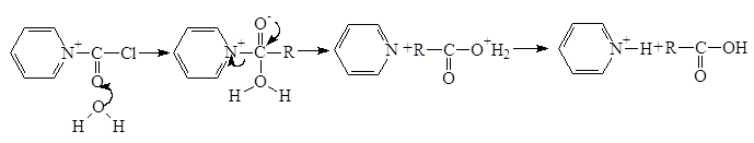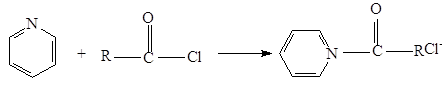 Третичные амины взаимодействуют с хлоангидридами, давая четвертичные соли, которые сами являются ацилирующими агентами. Примером такой реакции служит образование солей в пиридине. такая соль ацилирует воду. Процесс в целом представляет собой гидролиз ацилгалогенида, катализируемый пиридином.