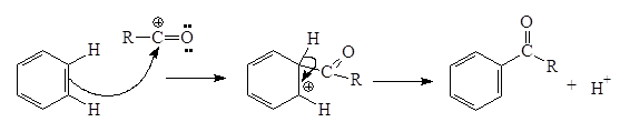 Положение равновесия зависит от природы реагентов и от растворителя: высокая диэлектрическая проницаемость сдвигает равновесие в сторону образования карбениевого иона. Затем электрофильный агент реагирует с ароматической молекулой: