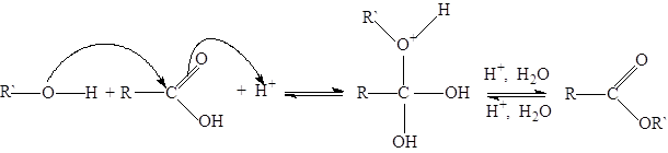 Скорость этерификации карбоновой кислоты, как и следовало ожидать, возрастает вместе с ростом положительного заряда на карбонильном углероде, т.е. с ростом кислотности. Так, муравьиная, щавелевая, пировиноградная кислоты реагируют достаточно быстро и без добавления катализатора. Сильно влияют на этерификацию стерические факторы. С ростом объема алкильных остатков, связанных с карбоксильной группой, а также спиртовым гидроксилом, скорость этерификации падает. Поэтому разветвление у a-углеродного атома, а также о-замещенные ароматические кислоты вступают в реакцию медленно и с плохими выходами. В ряду от первичных к третичным спиртам реакция затрудняется еще и тем, что в условиях реакции (сильнокислая среда) параллельно возрастает и тенденция к превращению спиртов в простые эфиры и олефины. Эфиры третичных спиртов получаются прямой этерификацией лишь с очень малыми выходами. Равновесие реакции этерификации не очень благоприятно для получения сложных эфиров. Равновесие можно сдвинуть вправо, используя 5-10-кратный избыток более дешевого исходного вещества (им обычно бывает спирт) либо постоянно удаляя из реакционной смеси продукты реакции - воду или сложный эфир. Общие методики этерификации карбоновых кислот. I. Связывание воды водоотнимающими средствами. Смешивают 1 моль карбоновой кислоты (или 0.5 моля дикарбоновой), 5 молей соответствующего абсолютного спирта и 0.2 моля концентрированной серной кислоты и кипятят без доступа воздуха с обратным холодильником 5 ч. В случае менее стойких вторичных спиртов лучше не применять в качестве катализатора серную кислоту, а насытить кипящую смесь хлороводородом и увеличить продолжительность кипячения до 10 ч. После этого отгоняют главную массу избыточного спирта на колонке Вигре длинной 20 см и выливают остаток в пятикратный объем ледяной воды. Органический слой отделяют, а водный раствор нейтрализуют водным трижды экстрагируют эфиром. Объединенные органические слои нейтрализуют раствором карбоната натрия, промывают водой до нейтральной реакции, сушат хлоридом кальция и перегоняют. Синтез может быть проеден и в полумикромасштабе. II. Азеотропная этерификация Смешивают 1 моль карбоновой кислоты (или 0.5 моль дикарбоновой), 1.75 моля спирта (можно и не абсолютного), 5 г концентрированной серной, толуолсульфоновой, нафталинсульфоновой кислоты или ионообменной смолы в Н-форме, например вофатита KPS, и 100 мл хлороформа или тетрахлоридуглерода. Смесь кипятят с обратным холодильником и водоотделителем, пока не прекратится выделение воды. При этерификации гидроксикислот, a, b-ненасыщенных кислот, а также при этерификации вторичными спиртами лучше не применять серную кислоту, чтобы исключить побочные процессы. При использовании ионообменной смолы жидкость необходимо перемешивать, в противном случае жидкость может выбрасывать из колбы. При окончании реакции смесь охлаждают, отмывают водой применявшуюся в качестве катализатора кислоту, промывают водным раствором гидрокарбоната натрия, еще раз водой, либо отфильтровывают ионообменную смолу. После этого отгоняют растворитель, который захватывает с собой примесь воды, остаток перекристаллизовывают и перегоняют. Синтез можно проводить и в полумикромасштабе. III. Экстрактивная этерификация. Смешивают 1 моль карбоновой кислоты, 3 моля мета