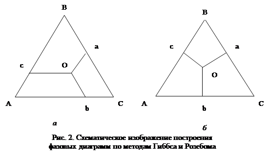 В методе Розебома за единицу принимается сторона равностороннего треугольника, на который откладывают мольные доли трех компонентов в расслаивающейся системе (рис. 2а). Через точки M и N проводят линии параллельные сторонам треугольника до пересечения их в точке О. Отрезок Оа, т.е. линия, соединяющая точку О со стороной, лежащей против угла А, отвечающего 100% данного компонента, равна его содержанию в трехкомпонентном растворе. Аналогично этому, отрезок Оb отвечает содержанию компонента Б и отрезок Ос - содержанию компонента С. В методе Гиббса за единицу принимается высота треугольника и состав смеси выражают линиями, перпендикулярными сторонам треугольника, соединяющими точки внутри его со сторонами, лежащими против углов, отвечающих 100% данного компонента (рис. 2б). Примеры фазовых диаграммВ зависимости от природы трех компонентов и их взаимодействия друг с другом фазовые диаграммы трехкомпонентных систем имеют различный вид.