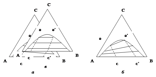 1. Три компонента образуют одну пару ограниченно смешивающихся жидкостей. Компоненты А и Б смешиваются друг с другом ограниченно, а компонент С растворяется в каждом из них. Точки фазового разделения образуют одну бинодаль, которая большей частью имеет параболическую форму. Однако ноды, т. е. линии соединяющие точки, отвечающие составам сосуществующих фаз, не всегда параллельны. Они могут иметь разный наклон в зависимости от растворимости компонента С в компоненте А и Б, т. е. от его коэффициента распределения между фазами: а) Компонент С растворим лучше в компоненте А, чем в компоненте Б, т. е. имеет к нему большее термодинамическое сродство. Он будет содержаться в большем количестве в фазе, обогащенной компонентом А. Следовательно длина отрезка ОС > О'С' (рис. 3а). По мере увеличения количества компонента С составы фаз сближаются, ноды укорачиваются и вырождаются в точку, являющуюся критической. Она лежит не на вершине кривой, а на ее правой ветви;