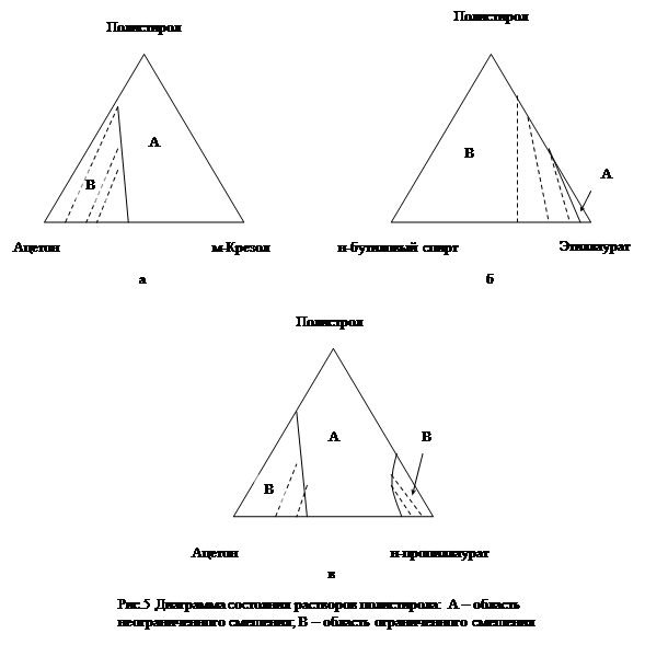 2. Три компонента образуют две пары ограниченно смешивающихся жидкостей. Фазовые диаграммы имеют одну или две гетерогенные области. Так, для системы вода - бензол - н-бутанол фазовая диаграмма имеет вид, представленный на рис 4а. Неограниченно смешиваются только бензол с н-бутанолом. Две другие пары смешиваются ограниченно. Имеется одна гетерогенная область: две кривые являются частями одной бинодали. На фазовой диаграмме метанол - изооктан - нитробензол имеются две гетерогенные области (рис 4б). Три пары ограниченно смешивающихся жидкостей. В этом случае на фазовой диаграмме могут быть две или три гетерогенные области, но имеется область неограниченного смешения всех трех компонентов (рис 5,а и б). Работы Бренстеда. Для построения диаграммы точную навеску полимера растворяют в определенном количестве хорошего растворителя и к прозрачному раствору постепенно добавляют плохой для этого полимера растворитель до появления помутнения. Зная количества всех трех компонентов в образовавшейся смеси, откладывают их доли на одной из сторон треугольника и через эти точки проводят линии, параллельные его сторонам. Точка их пересечения отвечает составу трехкомпонентного раствора. Таким путем Бренстедом впервые были получены диаграммы состояния систем полимер-жидкость I-жидкостьII. Они представлены на рис. 6. Сплошная линия отделяет область гомогенных растворов от гетерогенной области. Ноды соединяют токи, отвечающие составам двух сосуществующих слоёв, один из которых представляет собой бинарную смесь жидкостей. Размер области неограниченного смешения зависит от природы компонентов. Так, если взяты две жидкости, в одной из которых полимер набухает неограниченно, а в другой ограниченно, то область неограниченного смешения велика (рис. 6а). Если в одной жидкости полимер набухает неограниченно, а с другой совсем не взаимодействует, то область неограниченного смешения мала. Эта область ещё меньше, если в одной жидкости полимер набухает ограниченно, а с другой совсем не взаимодействует (рис. 6б). Для полимерных систем характерен случай