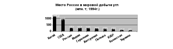П Диаграмма №1 Диаграмма №2 показывает 3 место России в мировой добыче угля в 1994 году после Китая и США.