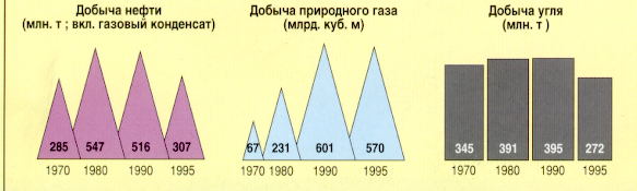 После распада СССР в России происходит падение объема добычи природного газа. Спад наблюдается в основном в Северном экономическом районе (8 млрд. м3 в 1990 году, 4 млрд. м3 - в 1994), на Урале (43 млрд. м3 и 35 млрд. м3 соответственно), в Западно-Сибирском экономическом районе (576 млрд. м3 и 555 млрд. м3) и в Северо-Кавказском (6 и 4 млрд. м3). Добыча природного газа осталась на прежнем уровне в Поволжском (6 млрд. м3) и в Дальневосточном экономических районах. В конце 1994 года наблюдалась тенденция к росту уровня добычи. Вот данные за последние 4 месяца года :