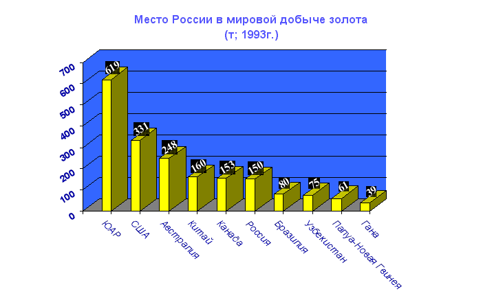 Диаграмма №5 показывает четвертое место России в 1994 году по добыче железной руды после Китая, Бразилии и Австралии. В России сосредоточено почти 40% мировых запасов железных руд. Общие балансовые запасы составляют около 65 млрд т, в том числе 45 млрд т - промышленных категорий (А+В+С1). Почти 30 млрд т (43%) представлено рудами, содержащими в среднем свыше 50% железа, которые могут использоваться без обогащения, и 15 млрд т (33%) - рудами, пригодными к обогащению по простым схемам. Из разведанных запасов железных руд на долю европейской части России приходится 88%, а на долю восточной - 12%. Крупным железорудным бассейном является Курская магнитная аномалия (КМА), где сосредоточено 66% общих балансовых железных руд страны. КМА охватывает в основном территорию Курской и Белгородской областей. Мощность пластов достигает 40-60 м., а в отдельных районах - 350 м. Руды, залегающие на значительной глубине, содержат 55-62% железа. Балансовые запасы железных руд КМА (кат. А+В+С1) оцениваются в 43 млрд т, в том числе 26 млрд т с содержанием железа до 60%, железистых кварцитов с содержанием железа до 40% - в 17 млрд т. На территории Северного экономического района расположено три месторождения железных руд - Ковдорское, Оленегорское (Мурманская область) и Костомукшское (Карелия). Руды Ковдорского месторождения характеризуются содержанием железа около 32% и повышенным содержанием фосфора (3%). Руды хорошо обогащаются с выделением апатита. Руды Оленегорского месторождения содержат 33% железа, а также марганец, титан и алюминий, залегают на небольшой глубине и имеют мощный пласт (от 30 до 300 м). Костомукшское месторождение осваивается совместно с Финляндией. Железные руды Кольского полуострова и Карелии служат сырьевой базой Череповецкого металлургического завода. Железорудные ресурсы Уральского района представлены в четырех группах месторождений - Тагило-Кувшинской, Качканарской, Баксальской, Орско-Халиловской. Тагило-Кувшинская группа включает месторождения гор Благодати, Высокой и Лебяжьей. Содержание железа в рудах - 32-55%. Она служит сырьевой базой Нижне-Тагильского комбината. Месторождение эксплуатируется открытым и подземным способами. Качканарская группа месторождений расположена на восточном склоне Уральских гор (Свердловская область). Руды титано-магнитовые, бедные по содержанию железа (17%), но легкообратимые. Они содержат ванадий и незначительный процент вредных примесей и служат сырьевой базой Нижне-Тагильского комбината и Чусовского завода. Баксальская группа железных руд расположена на западном склоне Уральских гор (Челябинская область). Содержание железа в бурых Железняках составляет 32-45%. Руды содержат марганец и очень мало вредных примесей. Они поставляются на Челябинский, Саткинский и Ачинский металлургические заводы. Орско-Халиловская группа месторождений размещена на восточном склоне Уральских гор (Оренбургская область). Руды содержат никель, кобальт, хром. Содержание железа - 35-55%. Они служат сырьевой базой Орско-Халиловского металлургического комбината. На Северном Урале железные руды сосредоточены в Северной и Богословской группах месторождений. Руды Северной группы (Свердловская область) представлены магнитными железняками с содержанием железа 40-50%. Эти группы имеют небольшие запасы железной руды. В Сибири разведанные запасы железных руд нев