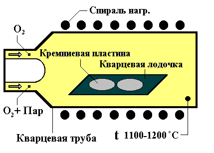 1. Процессы окисления кремния в парах воды и в сухом кислороде Благодаря своим уникальным электрофизическим свойствам двуокись кремния находит широкое применение на различных стадиях изготовления СБИС. Слои SiO2 используется как: 1. маска для диффузии легирующих примесей 2. для пассивации поверхности полупроводников 3. для изоляции отдельных элементов СБИС друг от друга 4. в качестве подзатворного диэлектрика 5. в качестве одного из многослойных диэлектриков в производстве КМОП элементов памяти 6. в качестве изоляции в схемах с многослойной металлизацией 7. как составная часть шаблона для рентгеновской литографии Среди преимуществ, обуславливающих использование этого диэлектрика, следует выделить то, что SiO2 является "родным" материалом для кремния, легко из него получается путем окисления, не растворяется в воде, легко воспроизводится и контролируется. Термическое окисление кремния Слой двуокиси кремния формируется обычно на кремниевой пластине за счет химического взаимодействия в приповерхностной области полупроводника атомов кремния и кислорода. Кислород содержится в окислительной среде, с которой контактирует поверхность кремниевой подложки, нагретой в печи до температуры T = 900 - 1200 С. Окислительной средой может быть сухой или влажный кислород. Схематично вид установки показан на рис. 1.