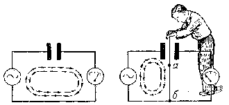 колебаний. Возникновение в усилителе самовозбуждения проявляется в виде сильных искажений и свиста. Опасность неустойчивой работы усилителя будет тем больше, чем выше частота переменного тока (тем меньшее сопротивление представляет для него емкость) и чем больше усиление лампы. Это обстоятельство создало весьма серьезные затруднения приему и усилению слабых сигналов высокой частоты и заставило искать способы борьбы с вредным влиянием емкости сетка — анод трехэлектродной лампы. Физика знает способы уменьшения емкости между двумя проводниками. Такими способами, например, является уменьшение размеров проводников,. образующих конденсатор, и увеличение расстояния между ними. Эти способы применялись при конструировании триодов, но значительного эффекта они не дали, потому что чрезмерно уменьшать электроды по ряду соображений нельзя (например, уменьшение размеров анода приводит к необходимости снизить анодный токи, следовательно, все параметры лампы), а увеличению расстояний между электродами кладут предел размеры лампы и ряд других причин. Наиболее удобным и легче всего осуществимым способом уменьшения емкости, оказалось экранирование. Сущность этого способа можно пояснить 'следующим примером. Пусть имеется цепь из конденсатора, источника переменного напряжения и измерительного прибора. В такой цепи будет течь ток, величину которого отметит измерительный прибор. Поместим теперь между пластинами конденсатора еще одну пластину и присоединим ее к нашей схеме в точке б. Когда это мы сделаем, то заметим, что стрелка прибора установилась на нуле: тока в цепи прибора не стало. Объясняется это тем, что ток теперь потечет по другому, более короткому пути — через емкость между левой и средней пластинами и далее *по проводу а—б. Путь переменного тока
