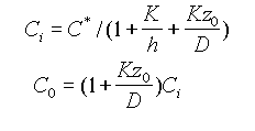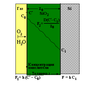 Рис. 2. Процесс окисления происходит на границе Si - SiO2, поэтому молекулы окислителя диффундируют через все предварительно сформированные слои окисла и лишь затем вступают в реакцию с кремнием на его границе. Согласно закону Генри, равновесная концентрация твердой фазы прямо пропорциональна парциальному давлению газа P: C*=HP, где C*- максимальная концентрация окислителя в газе для данного значения давления P, H - постоянный коэффициент Генри. В неравновесном случае концентрация окислителя на поверхности твердого тела меньше, чем C*. Поток F1 определяется разностью между максимальной и реальной поверхностной концентраций окислителя: F1=h(C*-C0), где C0 - поверхностная концентрация окислителя, h - коэффициент переноса. Значение концентрации окислителя C0 зависит от температуры, скорости газового потока и растворимости окислителя в SiO2. Для того чтобы определить скорость роста окисла, рассмотрим потоки окислителя в объеме окисла (F2) и на его границе с кремнием (F3). Согласно закону Фика, поток через объем окисла определяется градиентом концентрации окислителя: F2=-D(dC/dz)=D(C0-Ci)/z0, ( 1 ) где Ci - концентрация окислителя в молекулах на кубический сантиметр при z = z0, D - коэффициент диффузии при данной температуре, z0 - толщина окисла. Величина потока (F3) на границе окисла с полупроводником зависит от постоянной K скорости поверхностной реакции и определяется как: F3=kCi ( 2 ) При стационарных условиях эти потоки равны, так что F3 = F2 = F1 = F. Следовательно, приравняв соотношения ( 1 ) и ( 2 ), можно выразить величины Ci и C0 через C*: