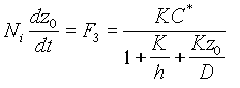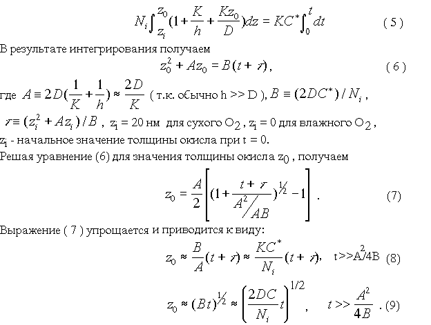 (4) Скорость роста окисла определяется потоком (F3) и количеством молекул окислителя (Ni), необходимым для образования окисла в единичном объеме. Поскольку концентрация молекул SiO2 в окисле равна 2,2*1022 см-3, то для получения двуокиси кремния требуется концентрация молекул кислорода равная 2,2*1022 см-3 или концентрация молекул воды 4,4*1022 см-3. Соотношение между величинами z0 и t определяется интегралом