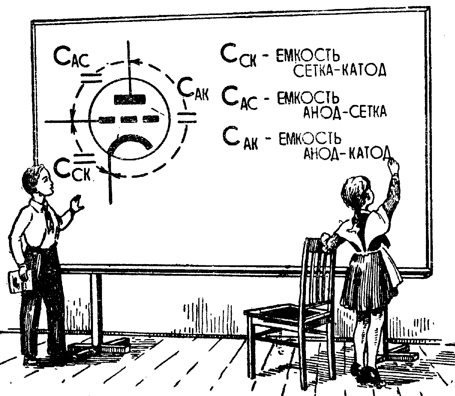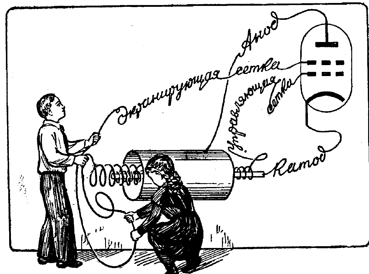 в обоих случаях показан стрелками. В правой части схемы, где находится измерительный прибор, тока не будет, она окажется как бы замкнутой накоротко проводом а—б. Это равносильно уничтожению емкости между пластинами конденсатора. Третья пластина явилась экраном, который свел емкость конденсатора к нулю. Важно то, что такой экран не должен быть обязательно сплошным. Его можно выполнить, например, в виде достаточно густой сетки—экранирующее действие при этом не изменится. Подобный экран можно применить и в электронной лампе. Для этого достаточно ввести в нее вторую сетку—спираль, поместив ее между анодом и основной сеткой. Эту дополнительную сетку называют экранной или экранирующей, а основную— управляющей, так как ее напряжение управляет анодным током. Введение экранирующей сетки приводит к резкому уменьшению емкости между анодом и управляющей сеткой, вследствие чего исключается опасность проникания усиленного напряжения из цепи анода обратно в цепь сетки и становится возможным получение устойчивого усиления колебаний высокой частоты. Лампы, имеющие экранирующие сетки, называются экранированными или—по числу электродов—тетродами («тетра» по-гречески—четыре). Экранирующая сетка должна быть конструктивно выполнена так, чтобы, уменьшая емкость между управляющей сеткой и анодом, она в то же время не создавала препятствий электронам в их движении к аноду. Это вполне осуществимо, так как расстояние между витками экранирующей сетки, конечно, не может идти ни в какое сравнение с размерами электрона. Но действие экранирующей сетки не ограничивается уменьшением вредной, или, как ее часто называют, паразитной емкости между управляющей сеткой и анодом. Экранирующая сетка одновременно позволяет значительно улучшить параметры лампы и в первую очередь повысить ее коэффициент усиления. Объясняется это тем, что на пути электронов к аноду появляется еще одна преграда — дополнительная сетка, значит, действие анода на электроны уменьшается, а чем меньше действие анода на электронный поток по сравнению с действием управляющей сетки, тем больше коэффициент усиления. На это как будто бы можно возразить, что и у триода можно получить очень большой коэффициент усиления. Мы уже говори-
