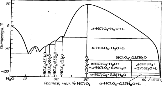 Диаграмма плавкости системы вода—хлорная кислота приведена на рис. 1 В табл. 1 приведена плотность водных растворов хлорной кислоты при различной температуре. Водные растворы хлорной кислоты обладают хорошей электропроводимостью и используются как электролиты для проведения некоторых электрохимических процессов, в частности, для получения хлорной кислоты. В табл. 2 приведено удельное электрическое сопротивление водных растворов хлорной кислоты при различной температуре. Температура кипения растворов хлорной кислоты различной концентрации при давлении 2,4 кПа составляет: