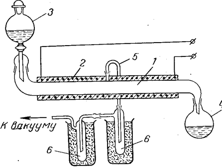 натрия переводят в перхлораты калия, бария или других металлов обменным разложением. Рис.8. Трехкамерный электролизер: / — анодная камера; 2 — пористая диафрагма, 3 — центральная камера; 4 — катионообменная мембрана; 5 — катодная камера; 6 — катод; анод; 8, 9 — соответственно катодная и анодная шины. Один из первых промышленных методов получения хлорной кислоты был основан на реакции между перхлоратом калия и серной кислотой КС1O4 + H2S04 = НС104 + KHS04 (3) Хлорную кислоту отгоняли дистилляцией в вакууме. При этом в случае применения достаточно концентрированной серной кислоты получали хлорную кислоту высокой концентрации, близкую к безводной. Реализация этого процесса в промышленности связана со сложностью аппаратурного оформления, ограниченностью материалов, пригодных для работы в среде хлорной и серной кислот, и необходимостью проведения отгонки хлорной кислоты в вакууме. Поэтому применение процесса целесообразно только для получения безводной хлорной кислоты. Для получения водных растворов хлорной кислоты предложено взаимодействие перхлората калия с кремнефтористоводородной кислотой в водном растворе КС104 + HsiF6 = НС104 + KsiF6 (4) При этом помимо растворов хлорной кислоты получают осадок плохо растворимого кремнефторида калия. После фильтрования осадка разбавленные растворы хлорной кислоты можно подвергать концентрированию и затем возгонке в виде азеотропной кислоты концентрацией около 72%. Однако получаемые осадки кремнефторида калия плохо фильтруются, что затрудняет практическое использование этого метода. Для получения безводной хлорной кислоты, помимо указанного взаимодействия солей хлорной кислоты с сильными неорганическими кислотами, применяют перегонку в вакууме смеси технической, примерно 70%-ной хлорной кислоты с трех—четырехкратным по объему количеством дымящейся серной кислоты. Предложен непрерывный процесс получения безводной хлорной кислоты обезвоживанием азеотропа олеумом с вакуумной отгонкой. Схема такой установки показана на рис. 10. На рисунке изображена лабораторная установка, однако по такому же принципу может быть создана и более крупная установка. В самом аппарате всегда находится небольшое количество подвергаемой обработке смеси кислот, что уменьшает опасность, связанную с возможными взрывами. При смешении кислот требуется охлаждение смесителя во избежание перегрева и возможного термического разложения хлорной кислоты.