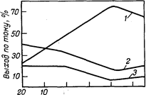 С изменением концентрации НС1 в электролите меняется соотношение парциальных токов, расходуемых на образование СLO4- и выделение СL2 и O2. На рис. 3 приведена зависимость выхода по току продуктов электролиза от концентрации соляной кислоты в электролите. Данные получены при 20 °С в 4 н. НСLO4 на платиновых анодах с потенциалом 2,8 В Наиболее высокие значения выходов хлорной кислоты по току получены для соляной кислоты концентрацией 0,8—2 н. При снижении концентрации соляной кислоты ниже 0,8 н. выход НСLO4 по току уменьшается за счет увеличения выхода кислорода по току. При повышении концентрации НС1 более 2 н. возрастает расход тока на выделение хлора, и выход по току хлорной кислоты также резко снижается. Оптимальная концентрация соляной кислоты в электролите увеличивается при снижении температуры электролиза и зависит от концентрации хлорной кислоты в электролите. Процесс анодного окисления соляной кислоты в хлорную сильно зависит от температуры. На рис. 4 приведена зависимость выхода по току продуктов электролиза от температуры раствора при содержании в электролите 4 н. НСLO4 и 1 н. НС1 и значении потенциала анода 2,8—3,0 В. С понижением температуры выход хлорной кислоты по току возрастает, а хлора и кислорода соответственно снижается. Содержание примесей в хлорной кислоте зависит от чистоты исходной соляной кислоты и применения достаточно стойких к коррозии конструкционных материалов для изготовления электролизеров, трубопроводов и аппаратуры. В отбираемой из электролизера хлорной кислоте содержится значительное количество ионов хлора. Для получения товарной кислоты необходима ее очистка от ионов хлора, которую осуществляют электрохимическим способом, т.е. возможно более полным окислением ионов хлора до хлорной кислоты. Однако при этом по мере снижения концентрации ионов хлора выход хлорной кислоты по току снижается и приближается к нулю при достаточно полной очистке раствора от примесей соляной кислоты. С увеличением степени очистки хлорной кислоты от ионов хлора снижается общий выход по току, возрастают расход электрической энергии и скорость коррозии платиновых анодов.