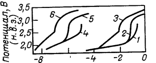 lg j, A/см2 Рис. 5. Влияние потенциала на скорость суммарного анодного процесса (/—3) и скорость растворения платины 4—6 в 3 н. Н НС104 при различной температуре: 1,4—при 57 °С: 2,5—при 25 0С; 3.5 — при —180С.