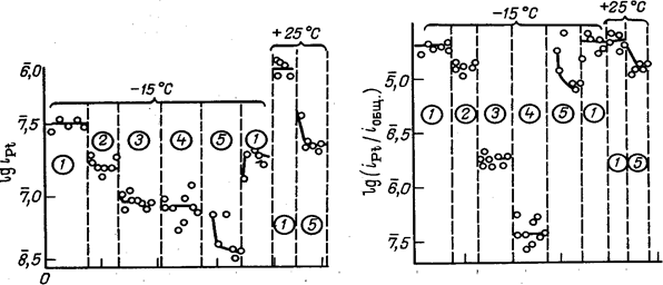 При очень высоких требованиях к чистоте хлорной кислоты последнюю можно дополнительно очищать от примесей НС1 отгонкой или отдувкой соляной кислоты инертным газом. Для очистки хлорной кислоты, получаемой из электролизеров продукционной стадии, от соляной кислоты можно применять также ректификацию. При этом отпадают трудности, связанные с электрохимической очисткой, и достигается более высокий суммарный выход хлорной кислоты по току. Хлористый водород, отгоняемый из хлорной кислоты при ректификации, можно вновь возвратить на стадию продукционного электролиза. Хлорную кислоту можно получать также анодным окислением хлора, растворенного в электролите — в 4—6 н. растворе хлорной кислоты . При электролизе таких растворов на платиновых анодах и серебряных катодах электролизеры, рассчитанные на нагрузку 3,5 кА при плотности тока 2 кА/м2 и температуре О °С, работали при напряжении 4 В. Процесс описывается суммарным выражением СL2 + 8Н20 — 2 НСLO4 + 7 Н2 (2) По этому методу может быть получена очень чистая кислота, поскольку со стороны не вводятся никакие загрязняющие примеси. Часть электролита отбирают и после перегонки получают 60—70%-ную товарную кислоту. Для электрохимического получения хлорной кислоты применяют электролизеры с платиновыми или платино-титановыми анодами . Вследствие очень высокой коррозионной активности смесей хлорной и соляной кислоты в качестве катода часто применяют графит. Графитовые катоды легко выдерживают остановки, связанные со снятием катодной поляризации. Известно, что при анодной поляризации платины в не сильно разбавленных растворах соляной кислоты при потенциалах отрицательнее 1,1—1,2 В (против н. в. э) происходит анодное растворение платины с выходом по току, близким к 100%. В этих условиях скорость растворения платины увеличивается с ростом потенциала, кислотности раствора и температуры. При потенциале платины (в анодную сторону) выше 1,1—1,2В наблюдается пассивация платины и при потенциале 1,3В в 1 н. НС1 скорость растворения платины снижается до 4•10-5A/м2 Пассивация поверхности платинового анода, наблюдаемая в процессе электрохимического получения хлорной кислоты, связана с образованием на поверхности слоев адсорбированного кислорода и фазовых оксидов различного состава. Структура оксидных слоев на поверхности платины и ее коррозионная стойкость зависят от соотношения концентраций НС104 ,и НС1 в электролите. В процессе электролиза соляной кислоты с целью получения хлора и водорода добавление к электролиту 50—150 г/л хлорной кислоты снижает скорость анодного растворения платины. При электролизе чистых растворов НС104 кислород связан с поверхностью платины более прочно, чем при электролизе смесей НС104 и НС1 На рис. 5 приведена зависимость плотности общего тока поляризации на платиновом аноде и плотности тока растворения платины от потенциала анода при электролизе 3 н. НС104 при различных температурах . С увеличением содержания НС1 в электролите количество фазовых оксидов на поверхности анода уменьшается. В процессе электролиза смесей НС104 и НС1 при высоких анодных потенциалах и постоянной суммарной кислотности увеличение содержания НС1 в электролите или растворение элементарного хлора приводит к повышению коррозионной стойкости платинового анода . Как при комнатной, так и при пониженной температ