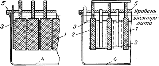 Рис. 8 Хлоратный электролизер Ангела: 1 — графитовые аноды; 2 — катоды; 3 — катодная рама; 4 — корпус электролизера; 5 — крышка. Сообщается о применении для получения хлорной кислоты электролизеров фильтр-прессного типа с биполярным включением электродов. Рамы электролизера, изготовленные из поливинилхлорида, снабжены диафрагмой из сетки, выполненной из полимерных материалов. Аноды покрыты платиновой фольгой, катоды — серебряные. Электролизер на нагрузку 5 кА работал при плотности тока 2,5 кА/м и напряжении на ячейке 4,4 В; выход по току составил около 60%. Предложено также получать хлорную кислоту анодным окислением водных растворов хлоратов в трехкамерном электролизере (рис. 9)с двумя ионообменными мембранами. При применении платиновых или платино-титановых анодов в анодном пространстве можно получить достаточно чистую 2 н. кислоту, а в катодном пространстве — раствор щелочи. При этом в качестве катода можно использовать обычную сталь. Хотя хлорная кислота, полученная электрохимическим окислением растворов НС1 или С12 в НС104, используется для производства различных перхлоратов, часто с успехом применяется также и обратный процесс — получение хлорной кислоты из перхлоратов щелочных или щелочноземельных металлов. В этом случае исходным сырьем обычно служит перхлорат натрия, получаемый электрохимическим окислением хлората натрия. Иногда перхлорат