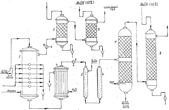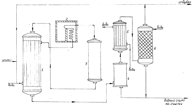 Газовая смесь, содержащая не менее 30% этилена, или чистый этилен, подаётся в нижнюю часть абсорбционной колонны 1 и поднимается вверх навстречу орошающей смеси из серной кислоты и этилсульфатов. Абсорбционная колонна представляет собой вертикальный цилиндрический аппарат, выложенный внутри кислотоупорным кирпичом. Внутри цилиндра имеются тарелки с колпачками и змеевиковые холодильники, изготовленные из хромоникелевой стали. На верхнюю тарелку абсорбера подаётся насосом 97-98%-ная серная кислота. К этой кислоте уже в абсорбере добавляется некоторое количество кислоты, содержащей диэтилсульфат и этилсульфат. Такая смесь лучше поглощает этилен, чем чистая серная кислота. Происходит поглощение этилена с образованием этилсерной кислоты и диэтилсульфата. Эта реакция экзотермическая. Для поддержания нужной температуры необходимо непрерывно отводить избыточное тепло, что и осуществляется при помощи водяных холодильников. Газ, отходящий из верхней части абсорбера, промывается в специальных скрубберах 2 - водой и 3 - щёлочью и используется или для пиролиза, или в качестве топлива. Вытекающий из нижней части абсорбера экстракт, представляющий собой смесь соляной кислоты с этил- и диэтилсульфатом, охлаждается в холодильнике 4 до 40°С и смешивается с водой. Из смесителя 5 охлаждённый экстракт направляется в гидролизёр 6 типа тарельчатой колонны, где при t°=80-90°С идёт реакция гидролиза с образованием спирта. Гидролизат, содержащий, кроме спирта, ещё и дтэтиловый эфир, соляную кислоту и небольшое количество побочных продуктов, подаётся в отгонную колонну 7. Здесь происходит отгонка эфира, спирта и других легколетучих веществ и одновременно заканчивается гидролиз оставшейся этилсерной кислоты. В нижнюю часть колоны 7 подаётся острый пар. Пары спирта-сырца после нейтрализации раствором щёлочи в колонне8 направляются на очистку и ректификацию. После ректификации получается этиловый спирт-ректификат (95% объёмных), практически ничем не отличающийся от спирта, получаемого путём брожения. В качестве побочного продукта выделяется диэтиловый эфир в количестве около 10% от спирта-ректификата. Недостатками сернокислотного метода является большой расход серной кислоты (на 1 кг спирта берётся 1,8-2 кг серной кислоты в пересчёте на моногидрат) и сильная коррозия многих частей аппаратуры. Непосредственное присоединение воды к этилену давно являлось заманчивым делом, но на пути к осуществлению этой реакции стоял целый ряд затруднений. Реакция является обратимой и идёт с выделением теплоты: