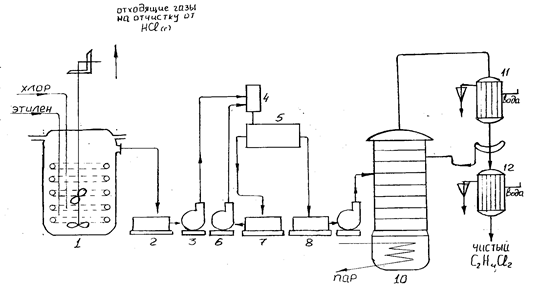 Процесс осуществляется в среде жидкого дихлорэтана, который растворяет хлор и этилен и обеспечивает необходимый отвод тепла из зоны реакции. Циркуляция дихлорэтана через выносной теплообменник позволяет вести реакцию с хорошим выходом при температуре 30-40°С. Дихлорэтан получил широкое практическое применение как неогнеопасный растворитель при извлечении жиров, а также для синтеза таких ценных химических продуктов, как этиленгликоль и его эфиры, этилендиамин, дибензил, хлористый винил, полисульфидный синтетический каучук (тиокол) и др. Дихлорэтан используется для борьбы с вредителями с/х (окуривание или фумигация). Дихлорэтан легко отщепляет хлористый водород, превращаясь в хлористый винил: активир. уголь