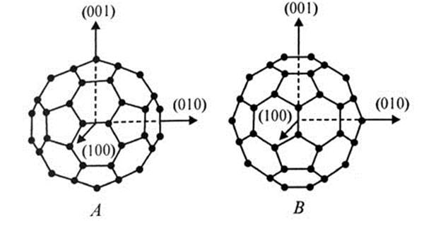 Рисунок1. Молекула фуллерена С60 в стандартных ориентациях А и В относительно кристаллографических осей. Для рассмотрения вопроса о длине связей в молекуле фуллерена вспомним понятие гибридизации атомных орбит. Электронная оболочка атома углерода содержит четыре валентных электрона конфигурации s^2p^2. Валентные электроны атома находятся на разных орбитах, отличающихся друг от друга распределением электронного облака в пространстве. На основании этого можно было бы предположить наличие связей, не равноценных ни по направлению, ни по прочности: p-орбиты должны создавать более прочные связи, чем s-орбиты. Однако, по данным, например, рентгеноструктурного анализа, молекула ВСl3(хлорид бора) содержит совершенно эквивалентные связи. Для объяснения подобных фактов было предположено, что валентные электроны формируют связи не за счет чистых s,p,d,f-орбит, а за счет смешанных, гибридных орбит. При гибридизации обеспечивается гораздо большее перекрытие электронных облаков вдоль линии, соединяющей центры атомов, чем в случае негибридизированных волновых функций. Благодаря этому происходит понижение энергии всей молекулы и упрочнение связей. При sp^3-гибридизации углам между направлениями, вдоль которых гибридные волновые функции имеют максимумы, соответствуют тетраэдрические значения 109°28'. Гибридизация d^2sp^3 дает октаэдр. В конфигурации алмаза каждый из четырех валентных электронов углерода принадлежит тетрагонально направленной sp^3-гибридной орбитали, которая создает прочную сигма-связь с соседним атомом. В случае графита каждый из трех валентных электронов принадлежит тригонально направленной sp2-гибридной орбитали, участвующей в формировании сильных внутреслойных сигма-связей, а четвертый электрон находится на орбитали pп, направленной перпендикулярно сигма-плоскости. Эта орбиталь формирует слабые, делокализованные пи-связи со своими соседями, при этом пи-связь часто называют ненасыщенной связью. Для графита расстояние между атомами в узлах гексагональной сетки равно 0.142 нм, а между сетками (слоями) 0.335 нм. Для простоты принято говорить, что углеродные атомы фуллереновой клетки имеют sp^2-гибридизацию. Однако это не совсем так, поскольку это возможно только для планарных структур, а отклонение приводит к частичной регибридизации. Для С60 примешивание сигма-связей приводит к состоянию sp^2. Связи, которыми соединяются 2 гексагона ((6,6)-связь, 0.139 нм), двойные и они короче, чем одиночные связи на границе пентагона и гексагона ((5,6)-связь, 0.145 нм). Различия в длине связей ослабевают для С60^-6 и исчезают для С60^-12. Для К6С60 длины связей равны 0.142 и 0.145 нм, в то время как для Li12С60 (6,6)-связь становится длиннее (5,6)-связи: 0.145 и 0.144 нм. Следовательно, причина чередования связей — в заселенности молекулярных орбиталей. 3. Электронная структура С60 Диаграмма энергетических уровней изолированной молекулы С60 схематически показана на рисунке 2. Колебательные состояния, связанные с каждым электронным состоянием, лежат выше соответствующего бесколебательного уровня на энергию (E), равную целому числу квантов энергии колебаний. Поглощение и испускание света между основным состоянием и первым возбужденным синглетным состоянием должны отсутствовать из-за того, что такие переходы запрещены по соображениям симметрии. Поэтому оптические переходы между эти