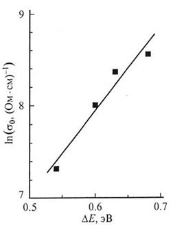 Рисунок 10. Зависимость префактора проводимости от энергии активации. Влияние кислорода на проводимость. Известно, что фуллериты очень чувствительны к атмосферному кислороду и при контакте с воздухом их электрические и оптические параметры меняются со временем. Молекулярный кислород проникает в решетку фуллерита, заполняя октаэдрические пустоты, и при высоком давлении все пустоты могут быть заполнены молекулярным кислородом без диссоциации С60 к кислороду, что играет существенную роль в изменении физических свойств фуллерита. Воздействие кислорода при атмосферном давлении и в присутствие освещения, повидимому, не приводит ни каким химическим реакциям между фуллереном и кислородом вплоть до критической температуры примерно 470 К. При нагреве в вакууме кислород может десорбироваться из материала, но при этом отжиг не ведет к полному восстановлению параметров. Большинство исследований в этой области выполнено на сублимированных фуллереновых пленках. Стабильность пленок по отношению к кислороду сильно зависит от их структуры (аморфная, мелко- или крупнокристаллическая пленка), при этом основное взаимодействие сводится к быстрой диффузии кислорода по границам кристаллитов и проникновению в объем на 10-15 нм. Поэтому анализ литературных данных затрудняется тем, что далеко не во всех работах вместе с проводимостью, фотопроводимостью, оптическим поглощением или иными параметрами анализировалась и структура пленок, что приводит к большому разбросу экспериментальных данных. В целом можно отметить, что проводимость монокристаллов и пленок С60 при контакте с кислородом быстро (за несколько минут) понижается на 3—6 порядков, в то время как экспозиция в атмосфере аргона, азота и гелия не оказывает влияния на проводимость. Спектральная зависимость фотопроводимости пленок в атмосфере кислорода качественно совпадает с фотопроводимостью бескислородных пленок, но абсолютные значения существенно ниже. Свойства пленок практически восстанавливаются при прогреве в вакууме до температуры 160—180 °С. Однако взаимодействие с кислородом в присутствии освещения приводит к необратимым изменениям в проводимости: ее значение при комнатной температуре падает до 10^-14 (Ом.см)^-1, причем активационная энергия возрастает до 0.95 эВ, т.е. близка к половине запрещенной зоны. Влияние кислорода на проводимость и фотопроводимость фуллеренов С60 и С70 чаще всего объясняется тем, что интеркалированный кислород создает глубокие ловушечные уровни для носителей заряда, расположенные на уровне 0.7 эВ ниже края зоны проводимости. Влияние кислорода на проводимость объясняется также созданием неупорядоченного потенциала, который локализует электронные состояния на краях HOMO—LUMO. При освещении образцов кислород вступает в химическую реакцию с образованием С-О - связей. Измерены температурные зависимости проводимости пленок С60 и С70 в диапазоне 77—500 К при давлениях кислорода от 10^ до1-10^-6 Торр (рис. 13). При высоких температурах в этих материалах наблюдается зонная проводимость, при низких доминируют прыжки по локализованным состояниям вблизи уровня Ферми. Кроме того, во всем интервале температур необходимо учитывать вклад третьего механизма, связанного с прыжками по локализованным состояниям около краев валентной зоны и зоны проводимости и характеризуемо