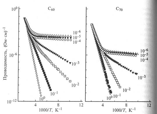 Рисунок 8. Схема энергетических уровней и возможных оптических переходов в пленках и растворах С60. 6. Проводимость. При анализе экспериментальных данных по проводимости фуллеренов можно выделить следующие основные особенности: наблюдается полупроводниковая проводимость n-типа; значения активационных энергий Еа температурной зависимости проводимости сигма = сигма exp (-Eа/kT) существенно ниже значений половины запрещенной зоны и достигают их лишь при высоких температурах; при взаимодействии фуллеритовых пленок с кислородом проводимость падает на несколько порядков; проводимость существенно зависит от структуры пленок и у кристаллического материала выше, чем у аморфного. Вследствие высоких значений сопротивления фуллерита в большинстве своем присутствуют измерения для температур от комнатной и выше (см. рис. 9). Для поликристаллических пленок значения активационной энергии и темновой проводимости при комнатной температуре составляют соответственно 0.3— 0.6 эВ и 10^-6 - 10^-8 (Ом.см)^-1. Для аморфных пленок эти значения лежат в интервале 0.5 - 1.1 эВ и 10^-7 - 10^-144 (Ом.см)^-1.