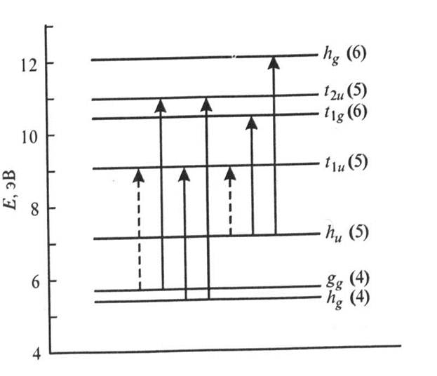 Рисунок 2. Диаграмма энергетических уровней изолированной молекулы С60. Экспериментальные и теоретические работы свидетельствовали о том, что энергия электронных переходов между наивысшей заполненной и наинизшей незаполненной молекулярными орбиталями (HOMO—LUMO) в С60 (как в изолированной молекуле, так и в конденсированном состоянии) лежит в оптическом диапазоне. Первое детальное теоретическое исследование электронной структуры С60 в твердотельном состоянии было выполнено Саито и Ошиямой. Физические свойства молекулы определяются ее электронной структурой, и в этом отношении С60 не имеет аналогов. В молекуле С60 имеется 60 пи-электронов, которые находятся в наименее связанных состояниях и, таким образом, определяют, как С60 будет связываться с другими атомами или молекулами в твердом состоянии. Распределение по энергиям этих пи-электронов показано на рис. 3. Пары пи-электронов с противоположным спином заполняют 30 нижних энергетических состояний (эти уровни показаны на рисунке 3). Обозначения уровней a, t, g и h соответствуют кратностям вырождения 1, 3, 4 и 5, а индексы g и и относятся к четной и нечетной симметрии волновой функции. Число состояний на уровне определяется побочным квантовым числом L; самый нижний уровень ag (L = 0) содержит одно состояние, следующий t1u (L = 1) содержит три состояния и т.д. Уровень с моментом L = 5, содержащим 11 состояний, на которых могут разместиться 22 электрона, вследствие икосаэдрической симметрии оказывается расщеплен на три отдельных уровня: hu + t1u + t2u. На самом нижнем из них, hu, находится 10 электронов, и это есть наивысшая заполненная молекулярная орбиталь; следующий уровень, t1u, называется наинизшей незаполненной молекулярной орбиталью, на нем может располагаться до 6 электронов.