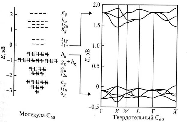 Рисунок 3. Распределение по энергиям 60 пи-электронов изолированной молекулы и зонная диаграмма энергетических уровней ГЦК фуллерита С60. Рассмотрим гипотетическую молекулу C60^10+. Полностью заполнены s, р, d, f, g-оболочки, принимающие соответственно 2, 6, 10, 14 и 18 электронов, итого 50. Полное заполнение ведет к тому, что угловые моменты распределены равномерно; гипотетическая молекула С60^10+ не имеет отклонений от икосаэдрической симметрии и не имеет различий в длине связей. В нейтральной молекуле нижний уровень hu оказывается полностью заполнен десятью электронами, которые образуют конфигурацию, аналогичную конфигурации локализованных сигма-орбиталей вдоль (6,6)-связей. Это приводит к слабой локализации пи-электронов вдоль ребра между гексагонами. Добавление 12 электронов на свободные уровни t1u и t2u возвращает симметрию, и длина связей выравнивается (случай Li12C60). Расчетные длины связей и собственных колебаний молекулы находятся в хорошем согласии с экспериментом по комбинационному рассеянию света, инфракрасному поглощению, неупругому нейтронному рассеянию. Для зазора HOMO—LUMO изолированной молекулы С60 рассчитано значение 1.9 эВ. В конденсированном состоянии этот зазор уменьшается из-за перекрытия волновых функций, связанного с соседними молекулами. Рассчитанная зонная структура С60 в твердотельном состоянии (ГЦК-решетка) показана на рисунке 3 справа. Наблюдается дисперсия в энергии пяти hu-вычисленных валентных зон и трех t1u - вычисленных зон проводимости. Вычисления показывают, что твердотельный С60 в ГЦК-решетке представляет собой прямозонный полупроводник с шириной запрещенной зоны 1.5 эВ. Оптические переходы между потолком валентной зоны и дном зоны проводимости являются запрещенными по соображениям симметрии, так как волновые функции начального и конечного состояний имеют одинаковую четность. Несмотря на многочисленные исследования электронной структуры С60, сведения об области энергий вокруг уровня Ферми остаются противоречивыми. Зонная структура С60 в ГЦК-решетке сходна со строением энергетических уровней изолированного кластера С60. Для зазора HOMO—LUMO изолированной молекулы С60 рассчитано значение 1.9 эВ. В конденсированном состоянии этот зазор уменьшается из-за перекрытия волновых функций, связанного с соседними молекулами. Наблюдается дисперсия в энергии пяти вычисленныхвалентных зон hu и трех вычисленных зон проводимости t1u. Вычисления показывают, что фуллерит С60 в ГЦК-решетке представляет собой прямозонный полупроводник с минимумом энергетической щели в точке X зоны Бриллюэна. Расчеты в приближении квазичастиц предсказывают величину щели 2.15 эВ, метод локальной плотности дает явно заниженное значение 1.5 эВ. Наиболее надежным значением для энергетического расстояния между серединами зон HOMO и LUMO можно считать 3.36 эВ при теоретическом значении 3 эВ. Ионизационный потециал равен 7.62 эВ, сродство к электрону 2.65, энергия низшего триплетного состояния 1.7 эВ. Работа выхода для аморфных пленок С60 определена как 4.53 эВ. Кулоновское взаимодействие между молекулами составляет U=1.6 эВ. Такое значение U должно приводить к возникновению экситонов Френкеля в районе 1.5-2 эВ. Возникновение экситонов Френкеля и экситонов с переносом заряда, характеризующихся тем ,что возбужденный электрон находится на одной молекуле, а дырка на друго