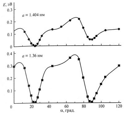 Рисунок 4. Полная энергия на молекулу как функция угла поворота в структуре Pm3m для двух различных постоянных решетки: a=1.404 нм соответствует атмосферному давлению, а=1.36 – внешнему давлению 1.5Гпа. На рисунке 4 показаны расчетные зависимости полной энергии фуллерита от ориентации молекул. Более глубокий минимум соответствует Р-ориентации. Те же расчеты, выполненные для постоянной решетки а = 1.36 нм, что соответствует давлению 1.5 ГПа, демонстрируют, что обе ориентации равновероятны. При 260 К пентагонная ориентация составляет 60 %, а около 90 К 84 %. Прикладывая давление, можно создать полностью ориентированную фазу С60, несмотря на то что экспоненциальный характер распределения в принципе запрещает существование какой-либо полностью ориентированной фазы и тем более какой-либо линии на фазовой диаграмме. Тем не менее в эксперименте у функции P/H=f(T) после значения 80/20 происходит скачок к распределению 98/2. Причина скачкообразного изменения фазы может быть следующая. Потенциал молекулярной реориентации должен учитывать не только вращение одной молекулы, но и когерентное коллективное движение всех молекул. В первом случае отенциал будет иметь один минимум: полностью ориентированное состояние. Разумно предположить, что кристалл состоит из большого числа Р- или Н- ориентированных микродоменов, а не из смеси беспорядочно ориентированных молекул. Далее, логично ожидать, что переключение в полностью ориентированную фазу произойдет, когда ориентированы 11 молекул из 12. Кроме того, можно предполагать, что однажды сформированная Н-фаза будет сохранять стабильность до фазового перехода. Ниже 90 К все молекулярные реориентации замерзают, но, по видимому, некоторый ориентационный беспорядок остается, что приводит к наблюдаемому переходу типа стеклования вблизи 90 К. 4.2. Понятие об интеркаляции в фуллеритах При внедрении атомов примеси в фуллеритовую матрицу могут происходить два процесса. В первом случае атомы примеси распределяются в кристалле в виде отдельных кластеров. Для фуллеренов характерно другое явление, а именно интерполяция атомов примеси в решетку фуллерита. Интеркаляционные соединения представляют собой материал, в котором атомы или молекулы примеси захвачены между слоями кристаллической решетки. Формально химическая связь между интеркалянтом и матрицей отсутствует. Процессы интеркаляции широко изучаются, например, в графите, где атомы примеси внедряются в пространство между плоскостями решетки графита, не деформируя саму структуру кристалла. Интеркаляция атомов примеси в решетку фуллерена происходит несколько иначе. Фуллерены представляют собой трехмерный тип интеркаляционных соединений. Диаметр молекулы С60 велик по сравнению с размерами большинства элементов периодической таблицы. Следствием является очень большая для кристаллов, состоящих из атомов одного сорта, постоянная решетки (а = 1.42 нм; для сравнения в кремнии а = 0.54 нм, в германии а = 0.57 нм); для высших фуллеренов а еще больше. Из-за этого в межмолекулярные пустоты кристалла С60 могут внедряться, не деформируя решетку атомы примеси. Тем не менее не все элементы могут формировать объемные интеркаляционные соединения. В основном это щелочные, щелочноземельные и редкоземельные металлы. Решающим фактором при этом является сумма работ выхода металла Еf и энергии ко
