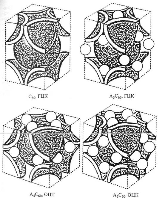 Рисунок 5. Строение элементарной ячейки интеркалированного фуллерена при различных заполнениях пустот решетки. Иными словами, при x = 3 все пустоты ГЦК-решетки заполнены и каждая молекула С60 приняла 3 электрона в зону проводимости t1u. Создалась наполовину заполненная зона. При увеличении количества металла структура перейдет в объемно-центрированную тетрагональную (ОЦТ) фазу и далее в кубическую (ОЦК). В последнем случае зона будет заполнена полностью, что соответствует диэлектрику. Так же как в случае графита, работает модель жестких зон. Атомы металла играют роль доноров, а валентная зона и зона проводимости сохраняют свой характер. Экспериментально показано, что в соединении АxС60 при малых x наблюдается падение удельного сопротивления; при увеличении x до 3 свойства материала становятся все более близкими к металлическим. Некоторые соединения А3С60 проявляют сверхпроводящие свойства. Далее при росте x удельное сопротивление опять увеличивается, и А6С60 фактически становится диэлектриком. 5. Оптические свойства фуллеренов В общих чертах оптические свойства фуллеренов С60 представлены на рис. 6. Спектр инфракрасного поглощения содержит 4 «исторические» линии: по ним был впервые идентифицирован фуллерен в работе Крэчмера. Спектры видимой и УФ-областей содержат пики, соответствующие разрешенным оптическим переходам, а также экситонам. Коллективные возбуждения приводят к существованию двух типов плазмонов: пи и пи + сигма, соответствующих возбуждениям п-электронов или всей электронной системы в целом. Спектры комбинационного рассеяния содержат 2 дыхательные Аg-моды, соответствующие симметричным колебаниям всей молекулы и пентагонов, и 8 Hg-мод. В первом приближении УФ- и видимый спектры поглощения фуллеритов сохраняют характерные черты молекул в газовой фазе или в растворе.