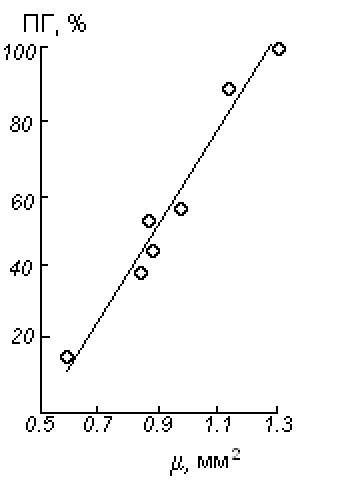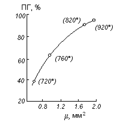Рис.2 Зависимость показателя горячеломкости (ПГ) сплава меди с 3% Sn и 0.5% Fe от размера зерна (m ), полученного в разных плавках. зарекомендовавшим себя на практике способом снижения горячеломкости. Однако следует заметить, что измельчение зерна не всегда помогает устранить брак по кристаллизационным трещинам в производственных условиях. Так, например, при полунепрерывном литье слитков благоприятное действие измельчения зерна проявляется преимущественно на алюминиевых сплавах со средней и низкой горячеломкостью.